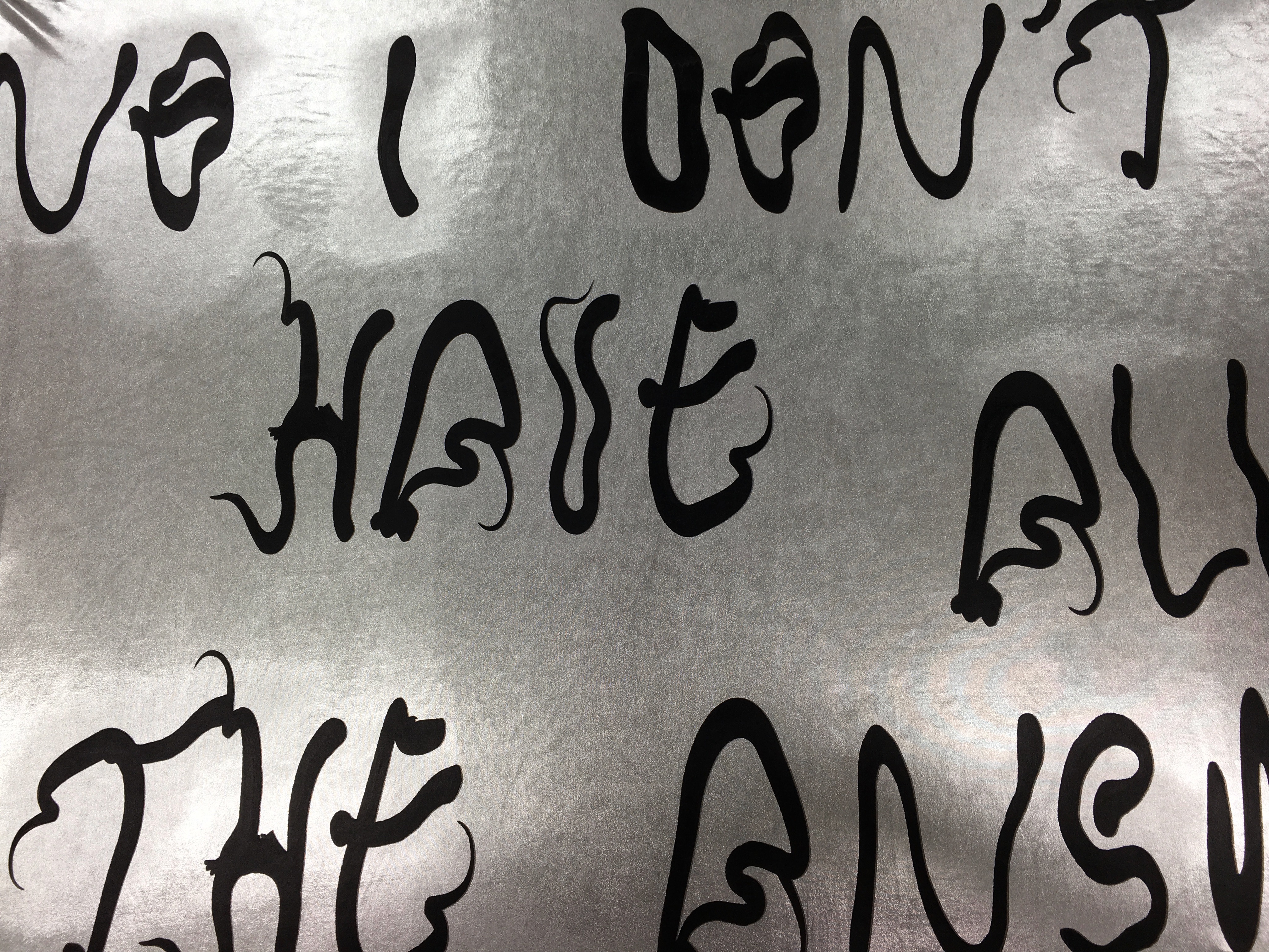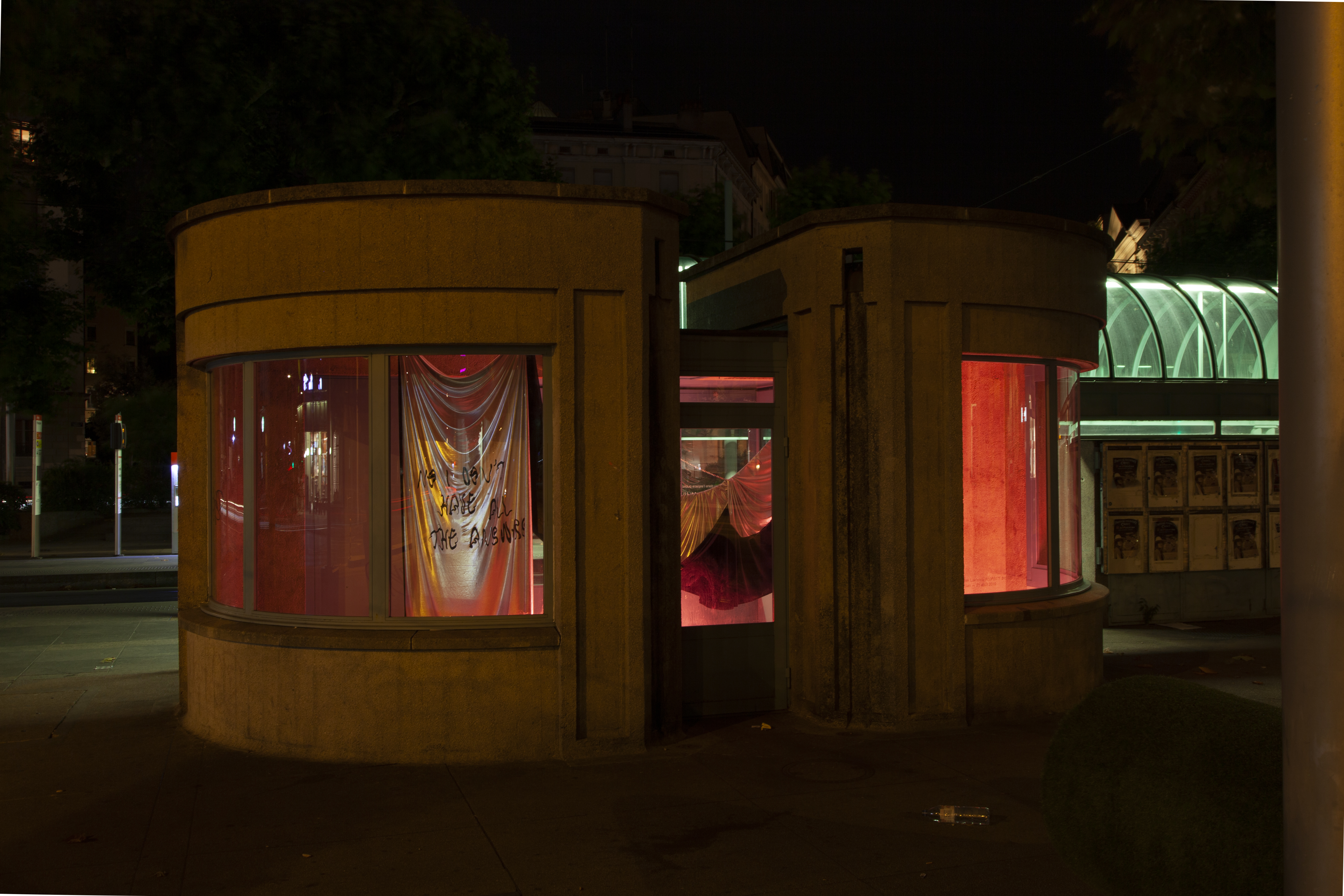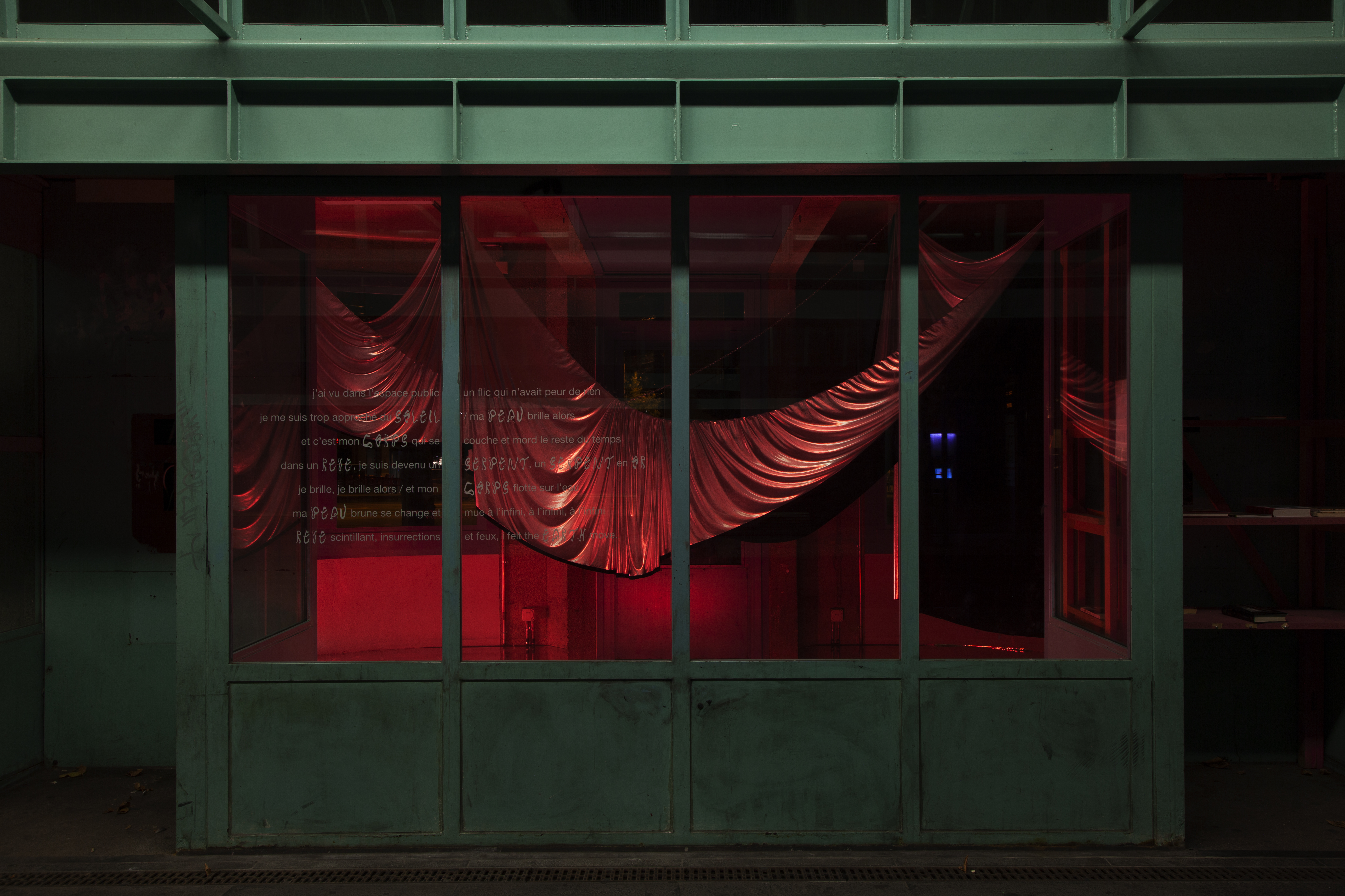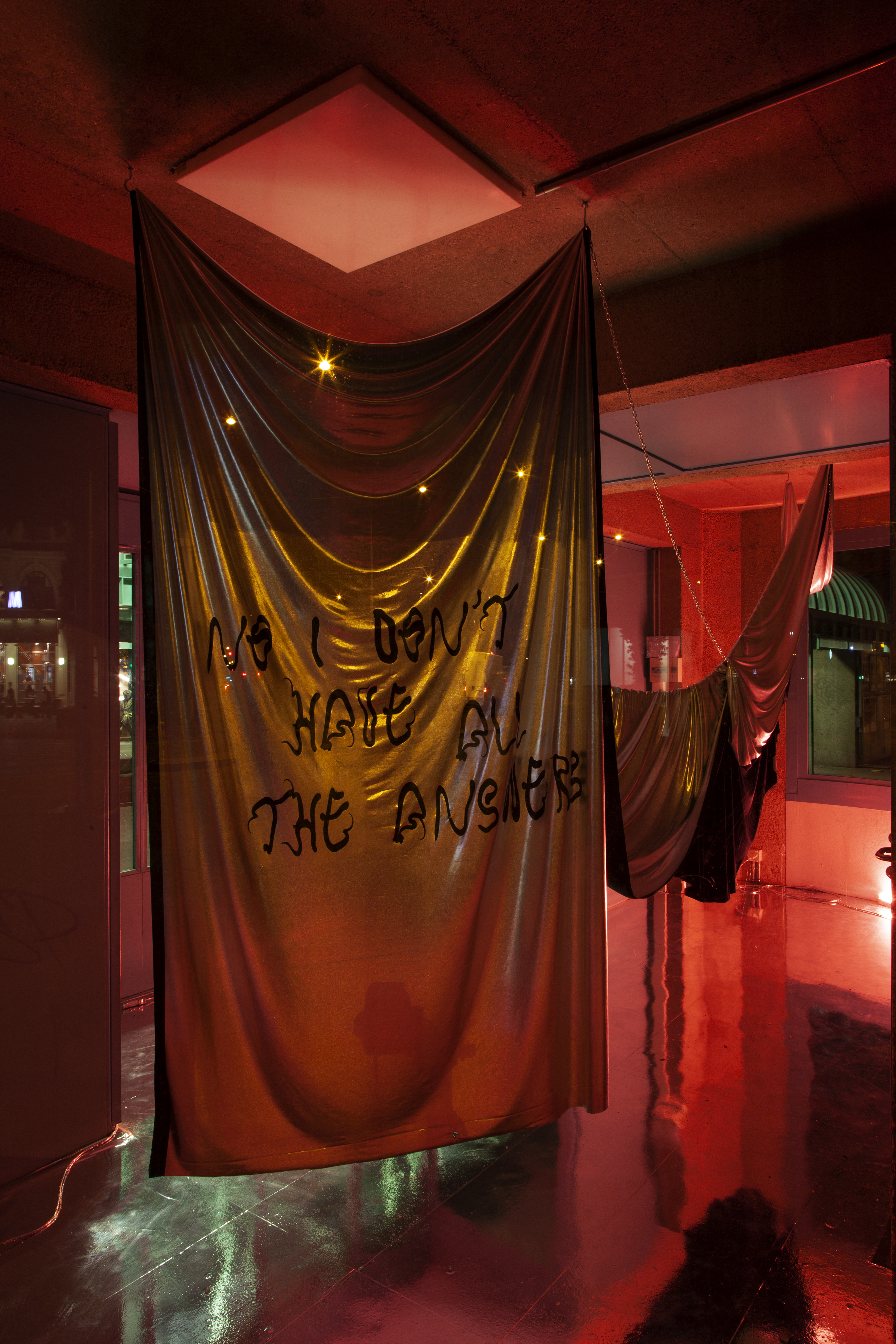 (2019), solo show, 24/24, 7/7, installation with fabric and chains, vinyl, Zabriskie, Geneva (CH). Courtesy of the artist. Graphic design : Valentin Bigel. Photos: Etienne Chosson.