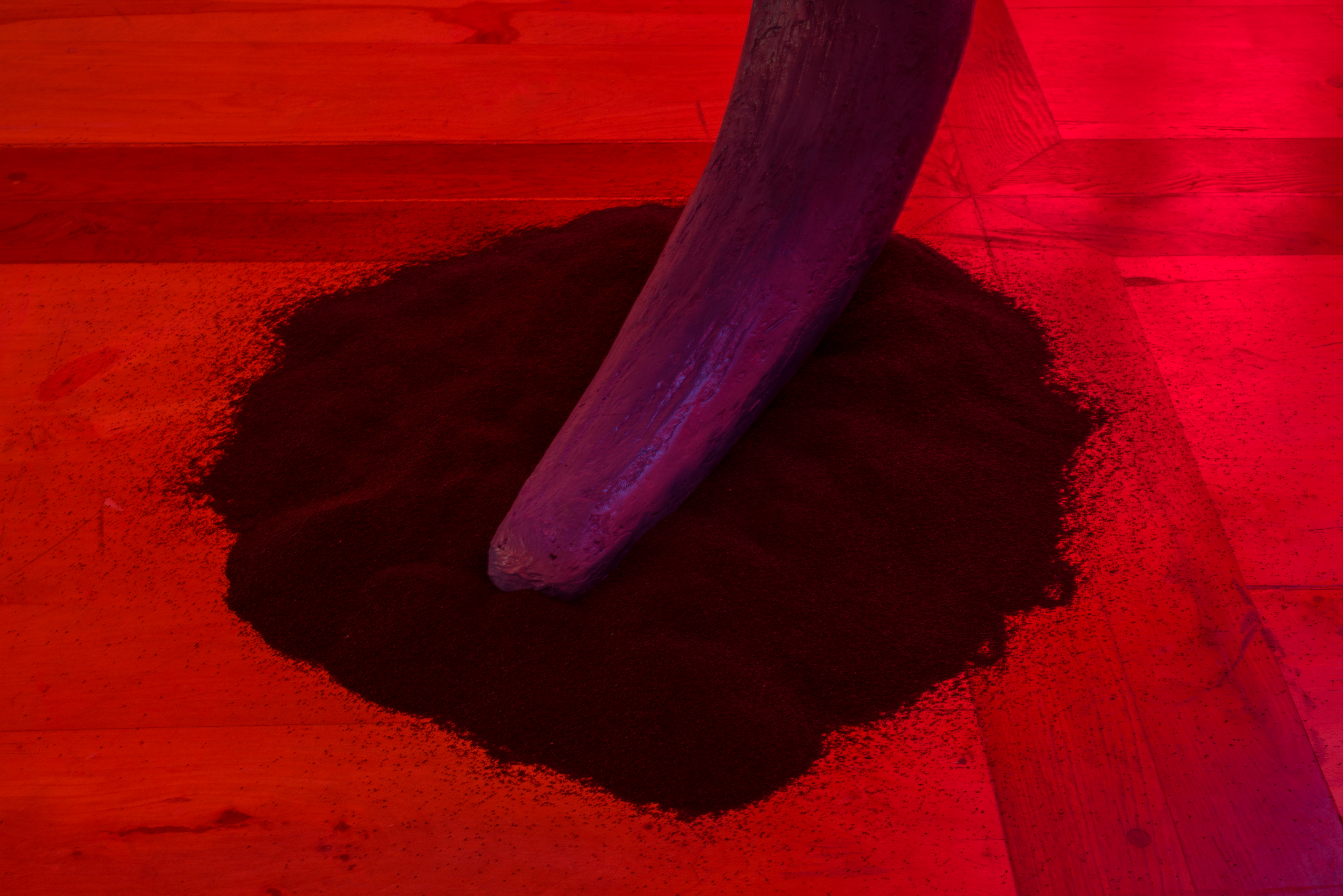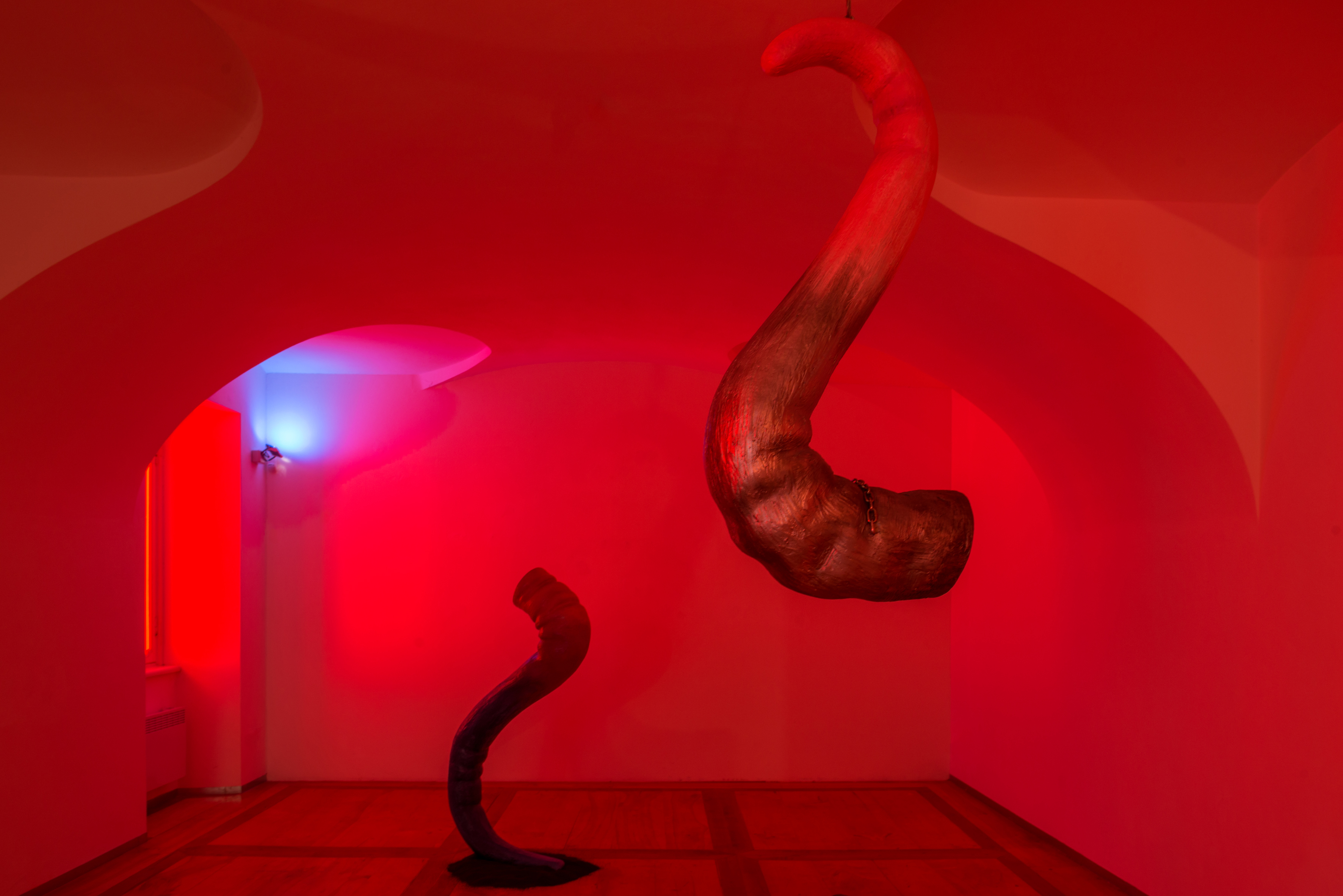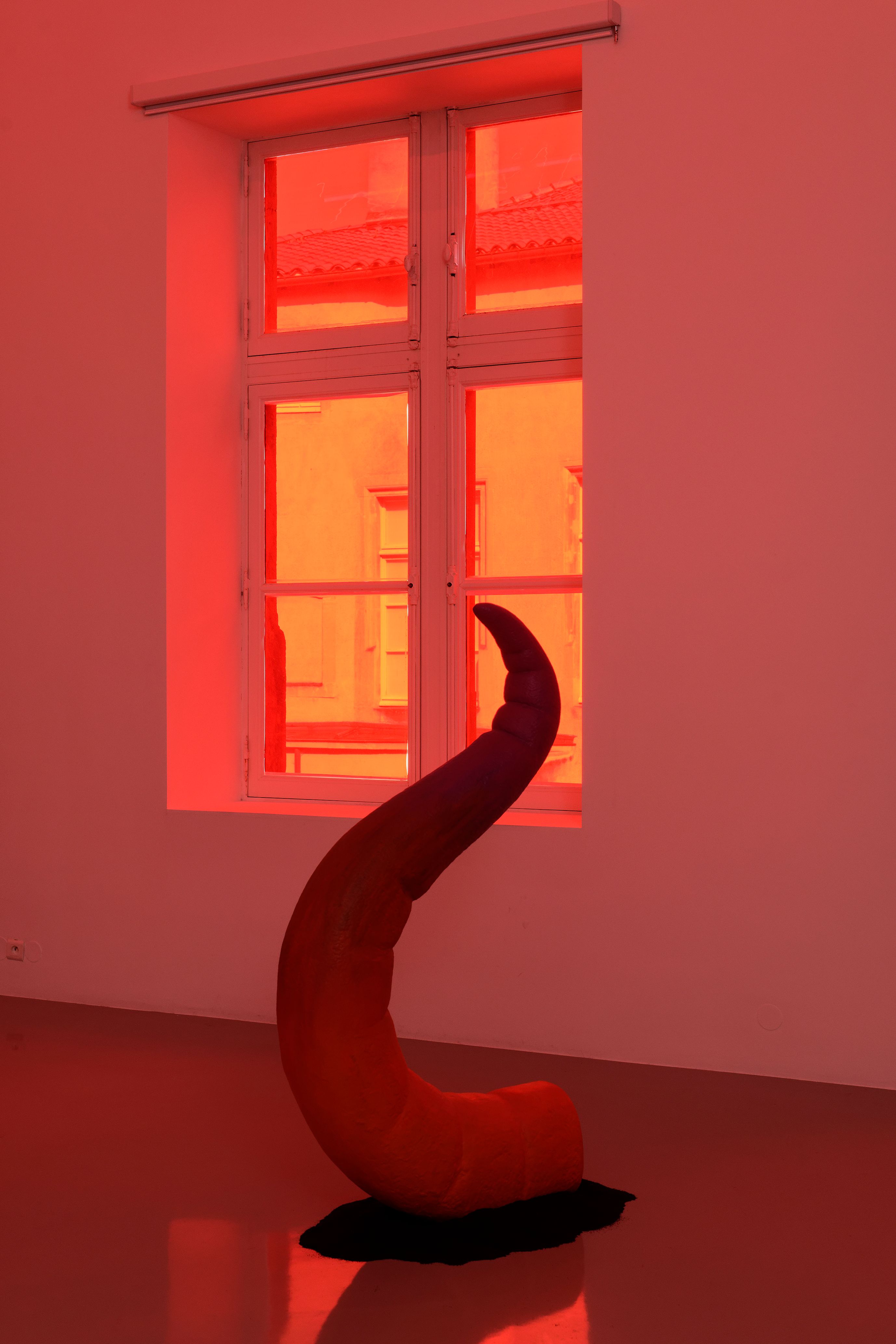 “This Doesn’t Belong to Me” presents a cycle of newly commissioned works the artist conceived specifically for the spaces of Palazzo Re Rebaudengo in Guarene (CN). The exhibition explores the concept of self-defence, interpreted as a practice of resistance developed by different social groups and subaltern bodies in order to survive. The image at the core of this cycle of artworks is that of the salamander: since Medieval bestiaries, this amphibian is said to be endowed with venom and able to survive among flames. In the show, the salamander becomes a symbol for counterpower, of both a political and sexual nature, which in performing self-defence rewrites the rules of conflict and connection. Autotomy – or the self-amputation of non-vital body parts, practiced by certain animals as a diversion for their predators – becomes the defensive tactic identified by Lakhrissi to imagine new strategies of urban guerrilla. The exhibition path of “This Doesn’t Belong to Me” begins with a ceiling installation composed of silver chainlets – talismans for protection in everyday life, which are also reminiscent of the instruments of pleasure employed in BDSM practices. The following room portrays a deferred scene, in which the conflict or intercourse has already taken place. The space is populated by a group of five sculptures in the shape of grotesque, out-of-scale salamander tails, which create a dream-like scenery evocatively dominated by the element of fire. The environment suggests a tension between visibility and absence, where the body is assumed as a platform continuously under construction and deconstruction, rather than an inalienable identity structure. In Lakhrissi’s representation, self-defence is a process of disidentification, the “strategy for survival and subversion” mentioned by José Esteban Muñoz. But more than that, it is a counteroffensive action, similar to the one described by Elsa Dorlin in her Se défendre: une philosophie de la violence [Self-defence: A philosophy of violence] (2018): “a different semiology of the militant body, which doesn’t rely on the exemplary nature of its own martyrdom, but rather on the relentless and inevitable nature of its revenge – that doesn’t belong to the metaphysics of purposes,