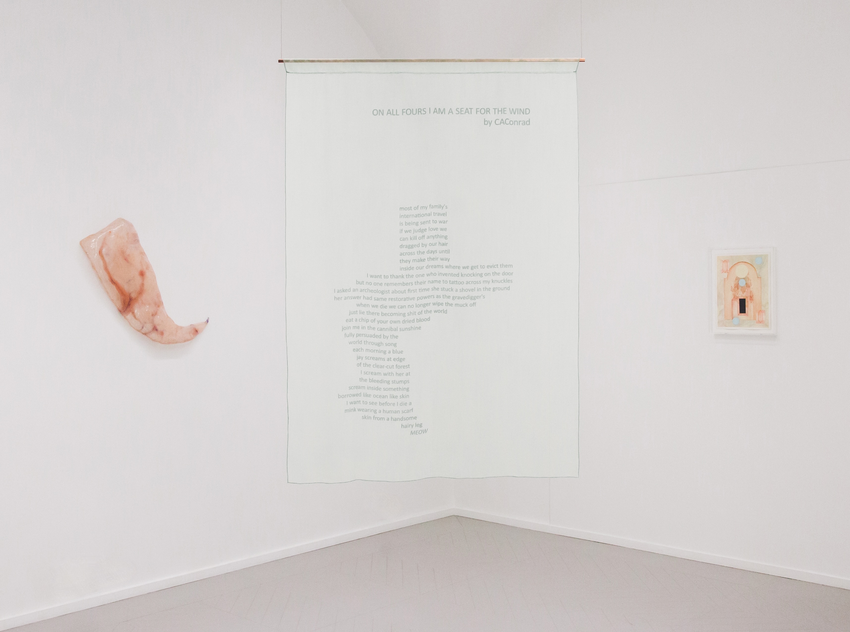 “As part of his newly conceived installation at the Kunstverein Kevin Space, I wear my wounds on my tongue, Lakhrissi accounts for and invites contingency and mutuality, drawing the contours of his proposition in relation to the communities it aims to speak to. Taking cue from Chin’s reluctant, yet plucky, (corporeal) titillation with, and (psychic) capitulation to, the tongue, the artist produced five resin sculptures, each a different color, that embody the shape of, and borrow texture from, the ill-famed digestive organ, which Lakhrissi likened, in a conversation we had over WhatsApp, to jellyfish, those gooey oceanic species that brush against you and release painful stingers when they care and desire, as any loving stranger with a Mars in Scorpio would. These sculptures, when hung around the exhibition space, conjure indeterminacy. When looked at from a given angle, they may be brushed off as props used to convey alien form in a low-budget science-fiction film; but when approached from an elsewhere, or even an otherwise, they can appear as weapons—sharp, imposing, and lethal as weapons are meant to be and present themselves as—ready to be toyed with, utilized, made love to, or feared. The sculptures are reminiscent of, and perhaps thought of as a continuation to, similar installations by Lakhrissi, Perfume of Traitors (2020) and Unfinished Sentence II (2019), presented respectively at VITRINE in London, CRAC Alsace, and the Palais de Tokyo, consisting in distorted metal blades and spears that point, ever so threateningly, towards audiences but are manufactured so as to be rendered harmless.” (extract from a text written by Edwin Nasr)